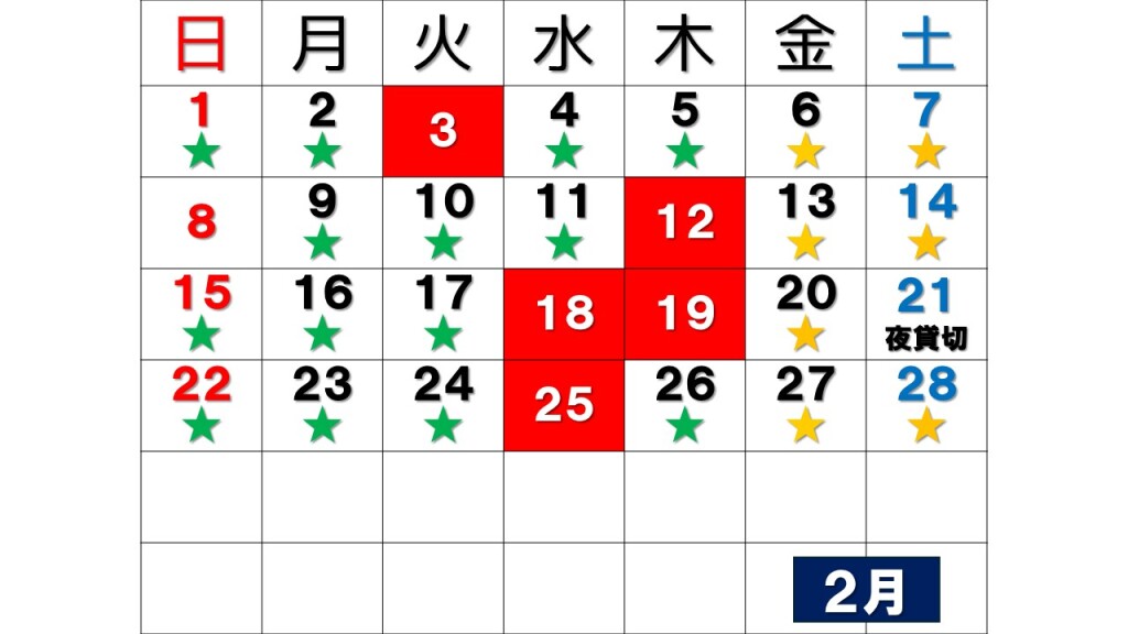 ※赤色はお休みです。★は星の居酒屋(バル)開催日(緑の星は前日までのご予約がある場合開催します。星のない場合はお休みです)となります。ディナー営業は完全予約制の為、ご予約のない日はランチ営業のみとさせていただきます。なお、星の居酒屋(バル)開催日(金、土)はディナー営業はございません。21日のディナーは貸切営業となっております。